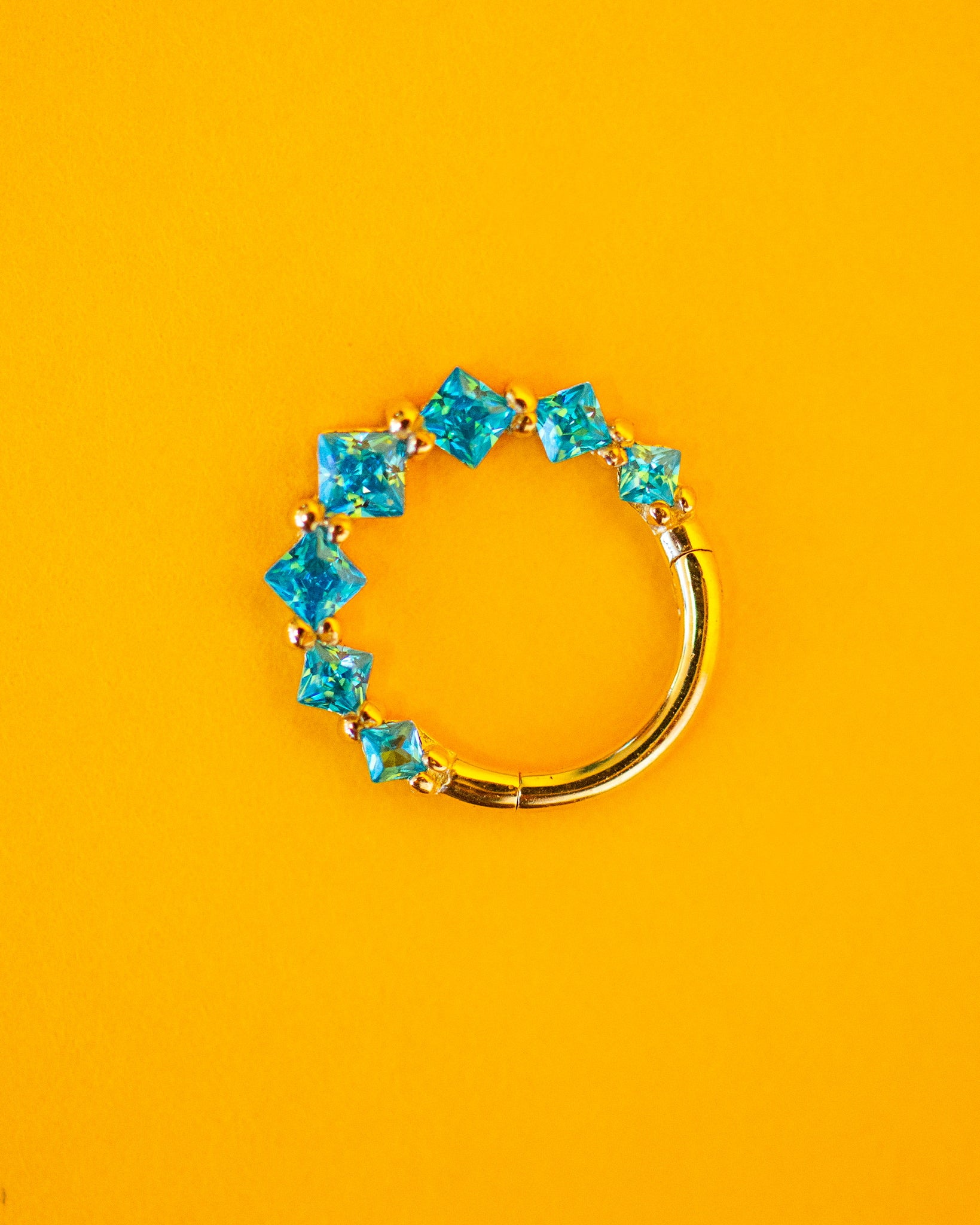 Introducing the 14K Tiara Hinge Hoop, where opulence meets functionality. Adorned with dazzling crystals, this exquisite hinge hoop transcends mere jewelry, becoming a statement piece of unparalleled elegance. Crafted for daith or septum piercings, its intricate design elevates your style effortlessly. It's your ticket to a world where sophistication meets radiance, one hinge at a time. Available as a single piece.