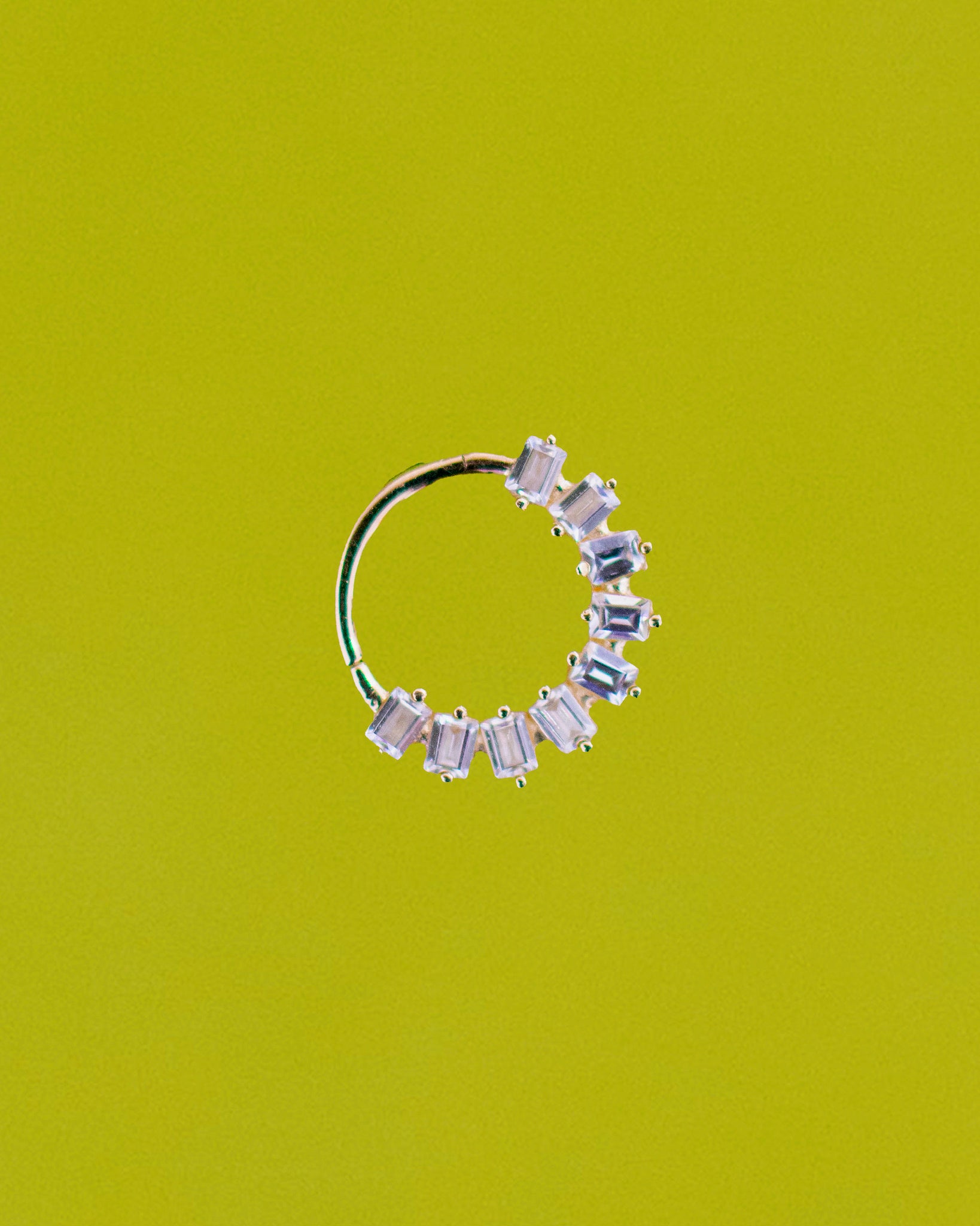 The mesmerizing 14K Chandelier Hinge Hoop, a masterful blend of luxury and allure. Embellished with shimmering baguette clear crystals, this hoop exudes timeless beauty and sophistication. Perfectly crafted for daith piercings or septum piercings. Its elegant chandelier design adds a touch of opulence to any look. Elevate your style to new heights with this radiant accessory, a must-have for those who appreciate exquisite craftsmanship and undeniable glamour. Sold as a single. 8mm diameter