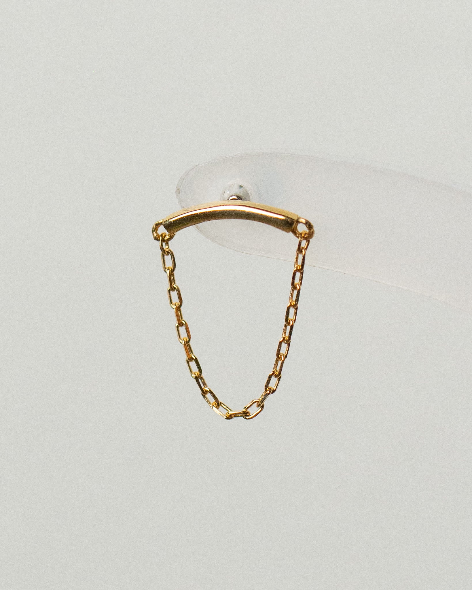 Sleek, shimmering, and made to move—the 14k Curved Chain Dangle is a delicate beauty designed specifically for vertical helix piercings. This solid gold piece features a gracefully arched bar that hugs the curve of your ear, finished with a fine chain that dangles with just the right amount of sway.