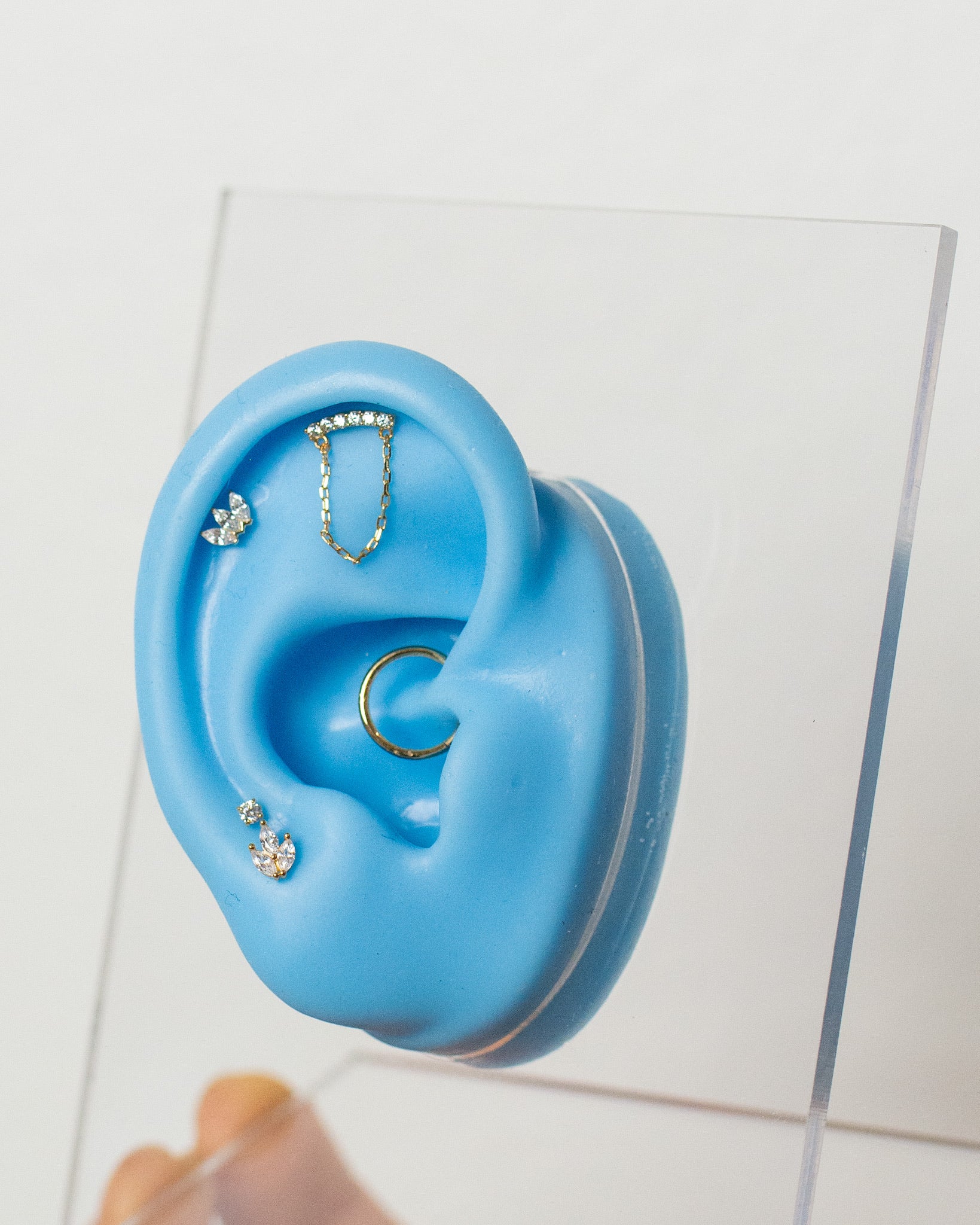 Indulge in the exquisite elegance of our 14K Diamond Chain Dangle, meticulously designed to adorn your Flat Piercing with sophistication. This captivating earring features a gracefully curved gold bar embellished with sparkling diamonds, lending a touch of opulence to your ensemble. The delicate chain dangle adds subtle movement, making this piece a perfect blend of modern glamour and timeless charm for any occasion.