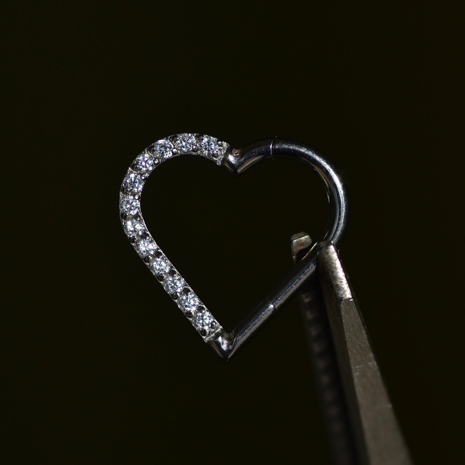 Delicate yet striking piece of jewelry, featuring a heart-shaped design with a secure hinge closure, perfect for adding a touch of elegance and romance to any ensemble.