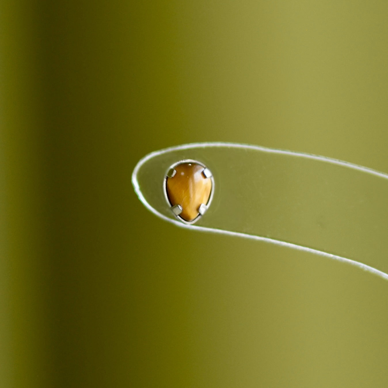 A smooth Tiger Eye cabochon is set in a sleek titanium bezel, highlighting the stone’s rich color and natural translucency. The modern, minimalist design contrasts the Tiger Eye’s organic beauty with titanium’s cool, matte finish.