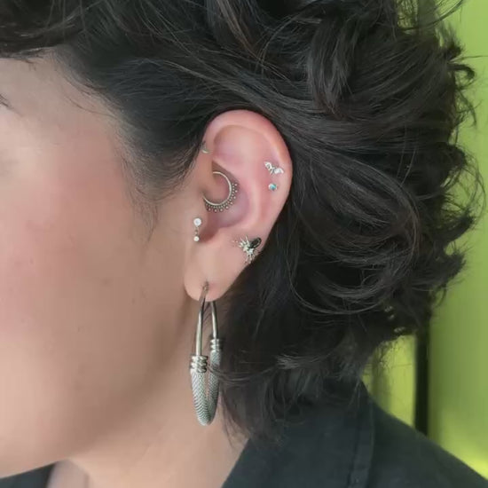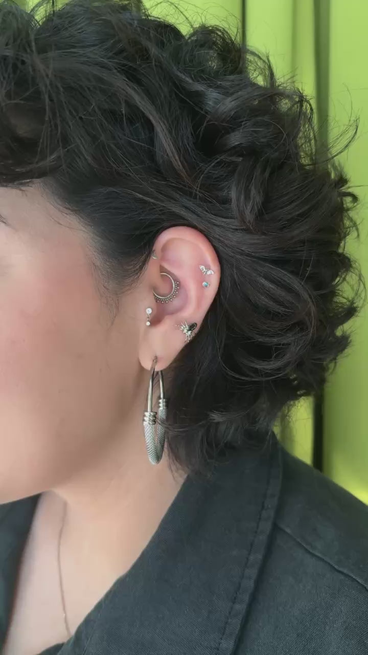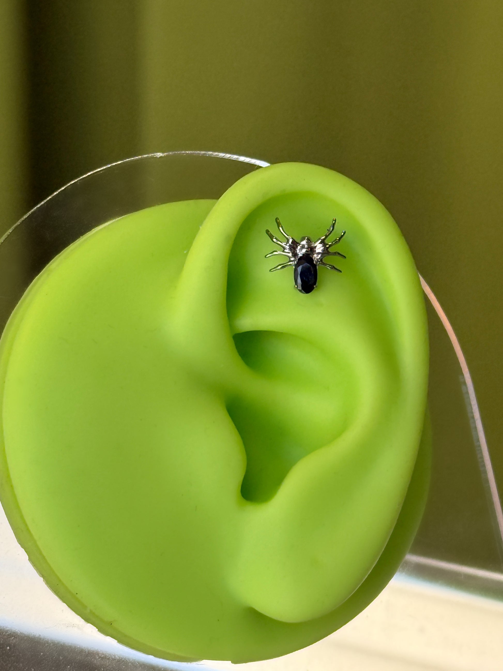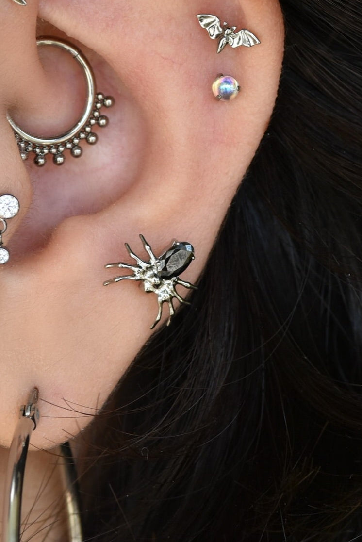 Spooky babes adorn yourself with this cute titanium black widow! This guy would make a great home nearly anywhere in the ear. It would also look stellar in a philtrum (Medusa) piercing